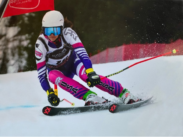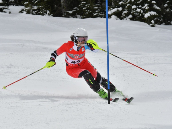 Photo to the right: Lisa Ballard clears a gate during the 2018 FIS Masters Criterium (world championships) at Mammoth Mountain, California. Her level shoulders are facing down the hill, countered against the direction her skis are going. Her left (outside) hand is in front of her chest as she’s about to clear the gate.